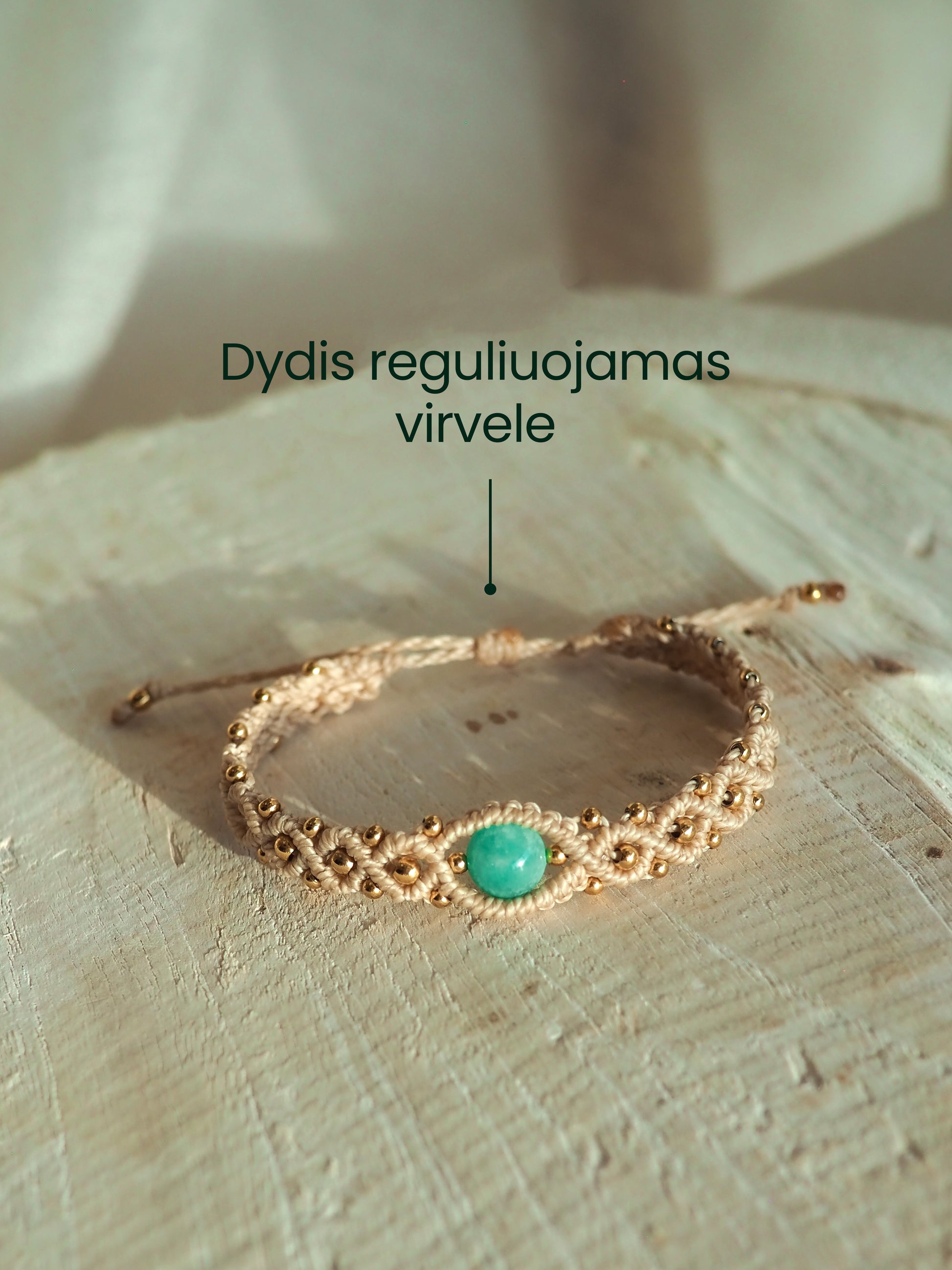 Apyrankės ilgis 15 cm+5 cm virvelė. Dydis reguliuojamas mazgeliu. Apyrankė tinka riešams, kurių apimtis 14-19 cm. Jeigu reikia trumpesnio arba ilgesnio papuošalo, užsakymo komentare nurodykite savo riešo apimtį. Papuošalą pritaikysime individualiai.