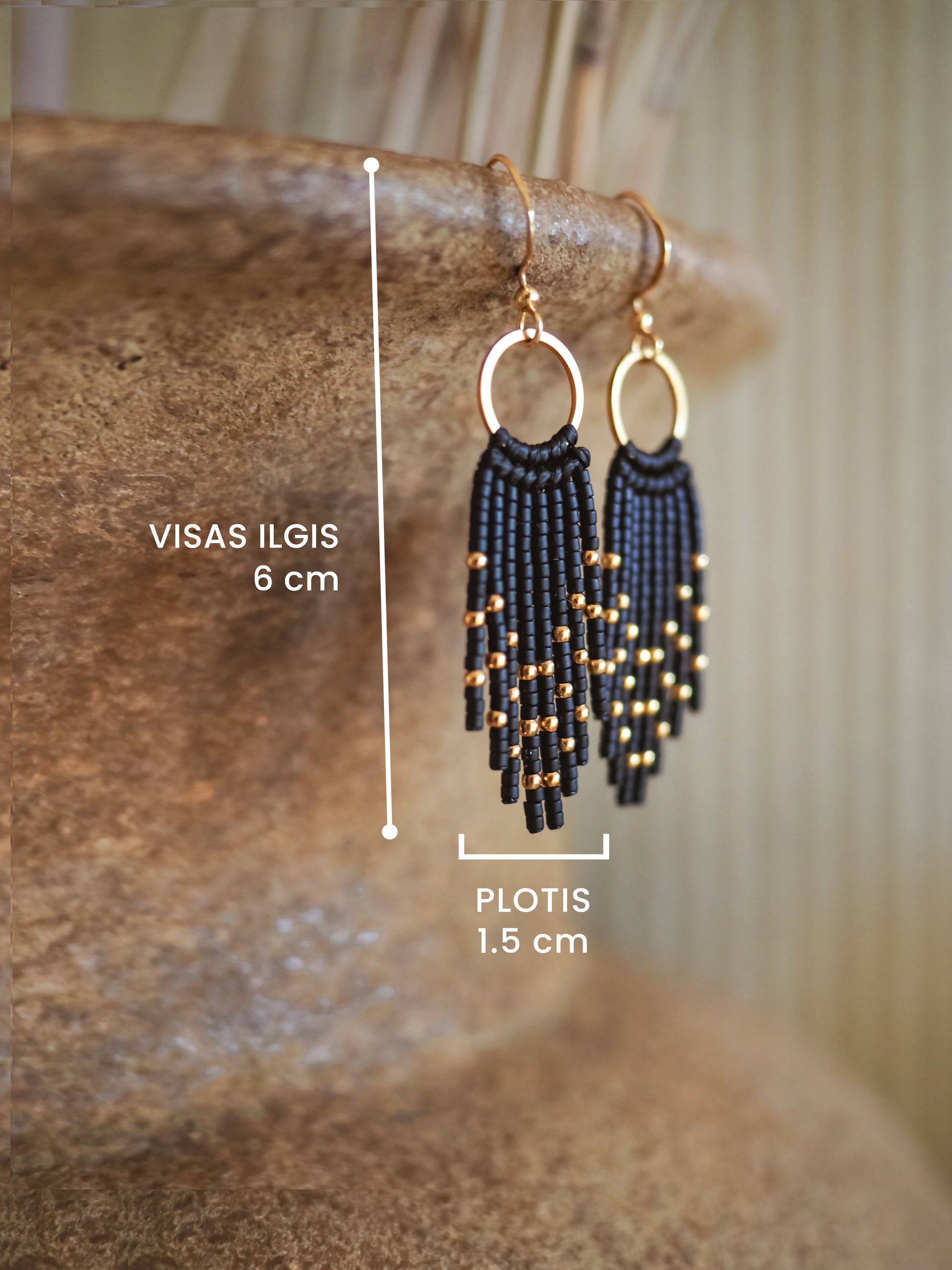Išskirtiniai 18k auksu dengti auskarai pagaminti iš aukštos kokybės juodų Miyuki stiklo karoliukų. Auskarai itin lengvi, todėl juos galima nešioti visą dieną beveik jų nejaučiant. Šviesoje karoliukai pagauna švelnų spindesį, suteikdami auskarams prabangos ir išskirtinumo. Idealus pasirinkimas, jei ieškote bohemiškos prabangos ir švelnaus meninio charakterio ✨