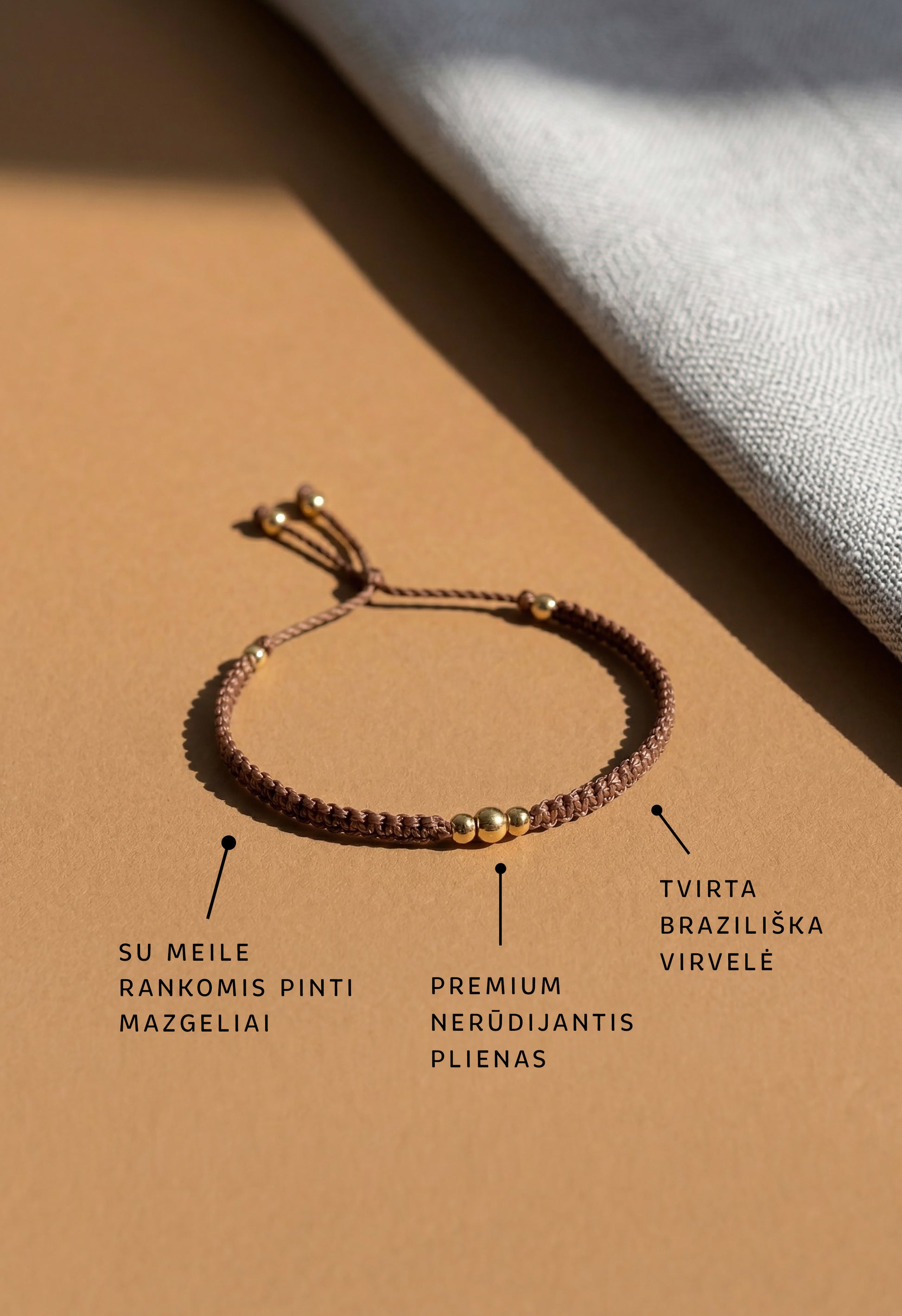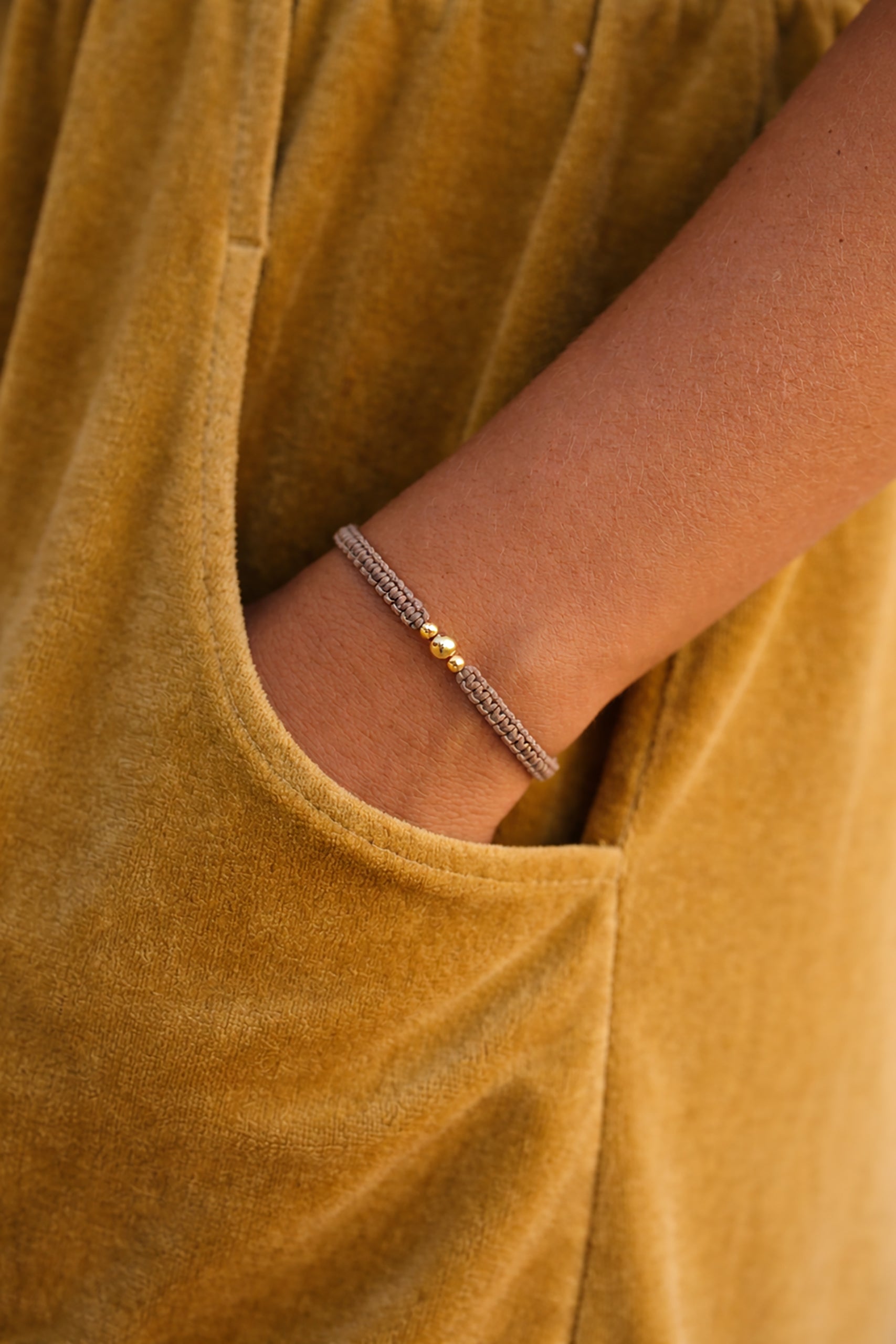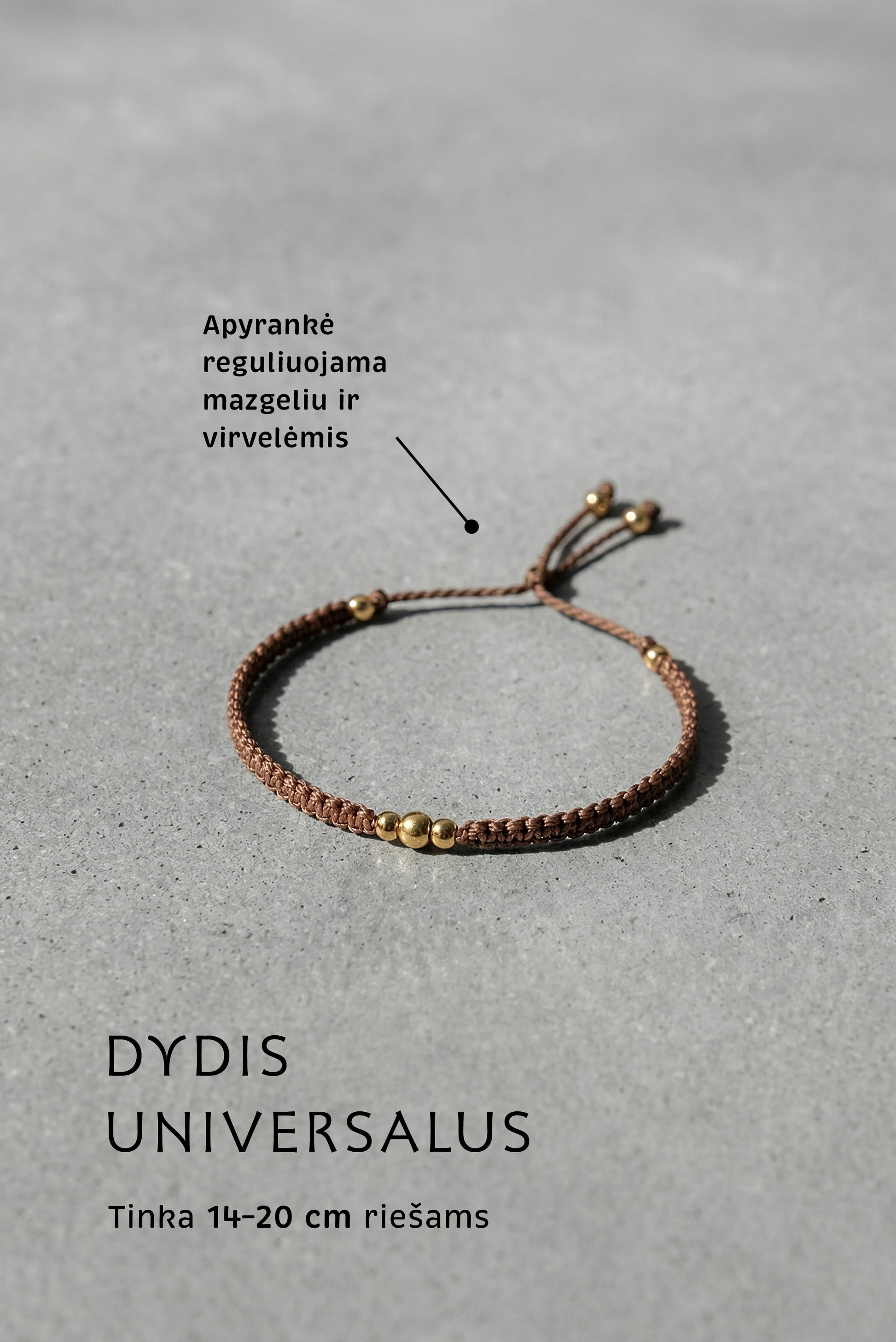 Macrame apyrankė pinta rankomis, sukurta iš kokybiškų ir tvirtų medžiagų. Auksiniai karoliukai niekada nenubluks, nepakeis savo spalvos nei nuo saulės, nei nuo vandens. Dydis reguliuojamas virvelėmis. Apyrankė labai patogi, jos visiškai nesijaučia, su ja galima miegoti ir ilgai nenusiimti, tinka kasdienai arba progoms.